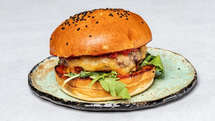200 g wołowiny, ciągnący ser w środku, 3 rodzaje sera na wierzchu, salsa, rukola