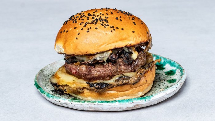 200 g wołowiny, pieczony grzyb, ser wędzony, karmelizowana cebula, majonez grzybowy