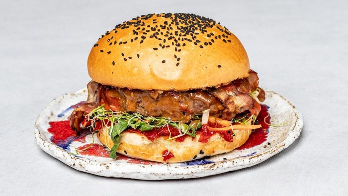 200 g wołowiny, chrupiący boczek, chilli dżem, masło orzechowe, sałata rzymska, kiełki pora, marchewka