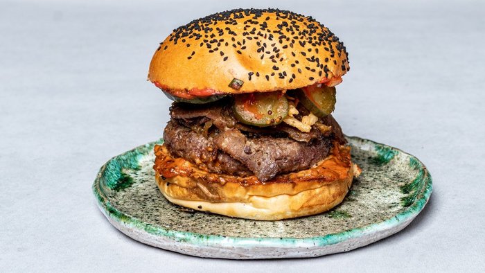 200 g wołowiny, 100g duszonej wołowiny, chrupiące krążki cebuli, karmelizowana cebula, pikle, salsa, fbb relish